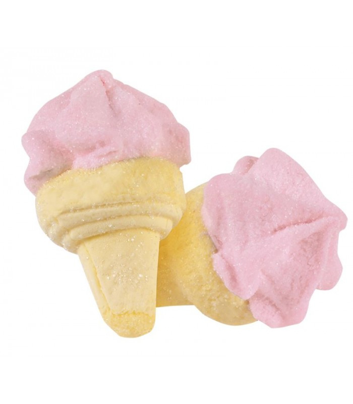 Marshmallow a forma di cono gelato, di colore giallo e rosa, al gusto frutta. Senza glutine. Adatti per confettate, party o decorazione di torte. Prodotto in Italia con ingredienti di prima scelta. 12 g
