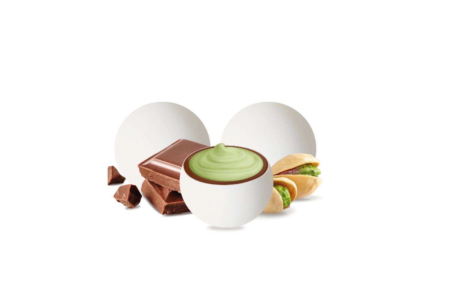 Cuore morbido al cioccolato bianco al gusto pistacchio ricoperto da cioccolato al latte e da un sottile strato di zucchero.