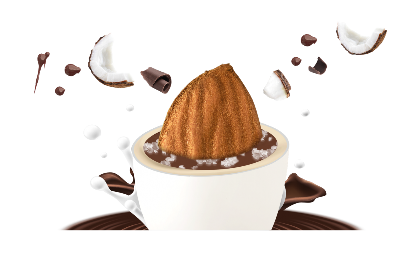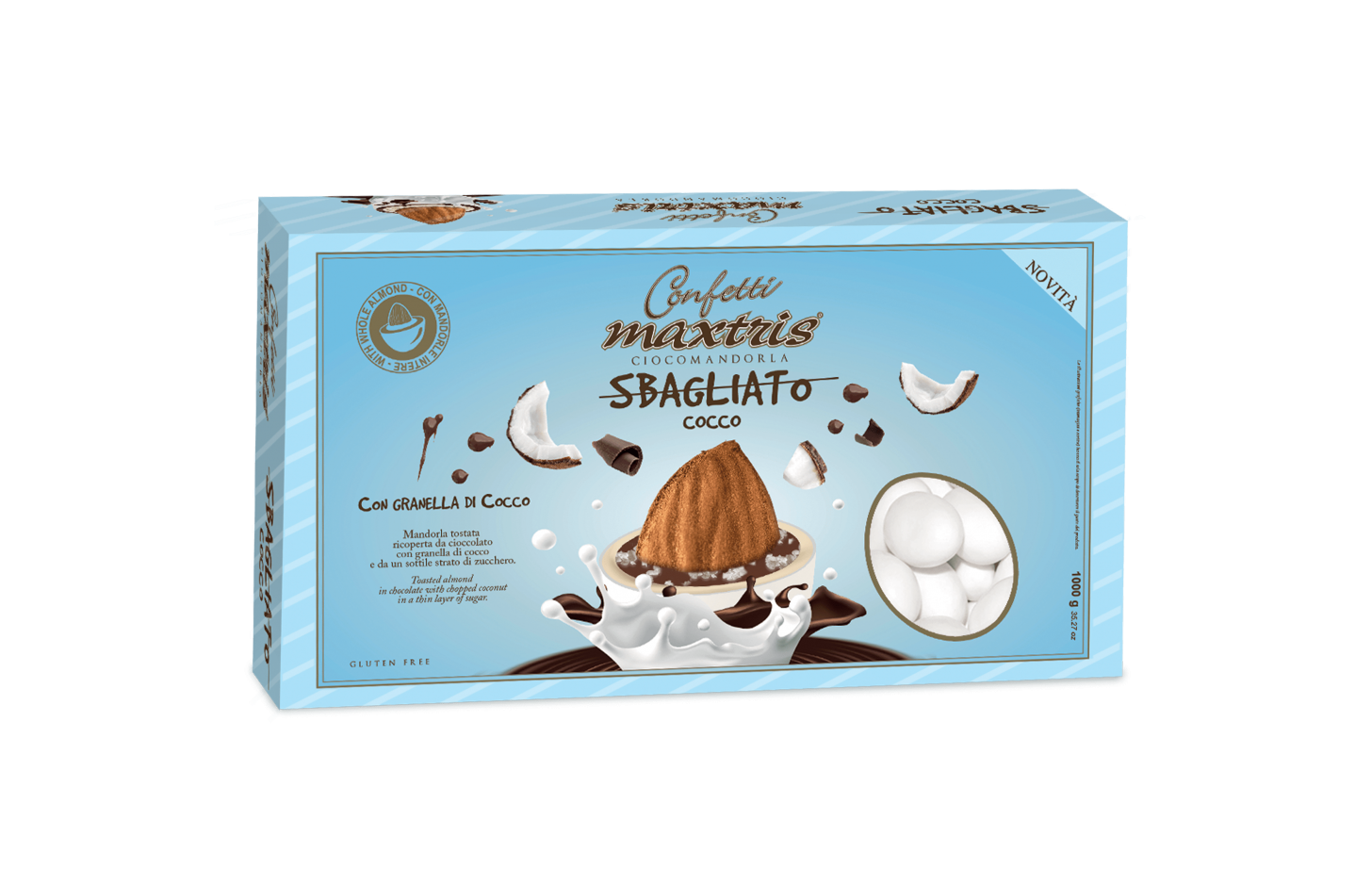 Mandorla tostata ricoperta da cioccolato al latte con granella di cocco, cioccolato bianco e da un sottile strato di zucchero.