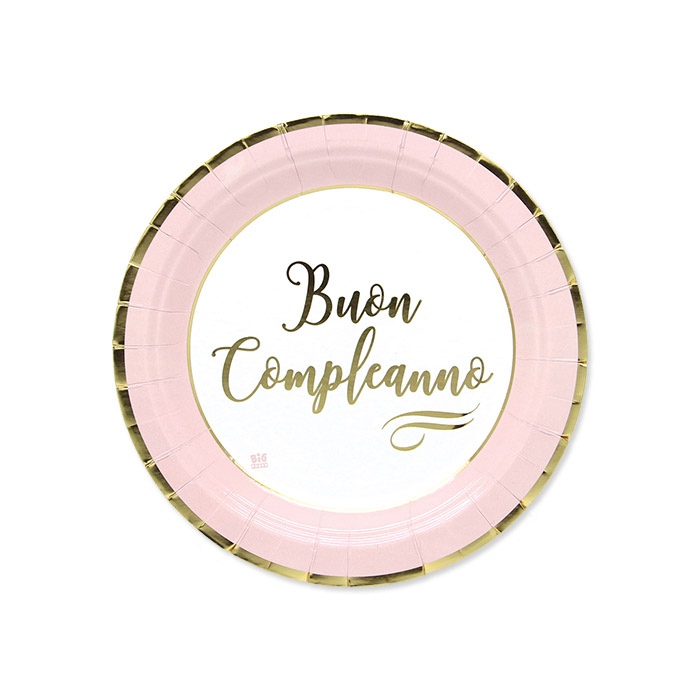 Confezione di 8 Piatti Rosa e Bianchi con stampa Oro ” Buon compleanno ” – Big Party .