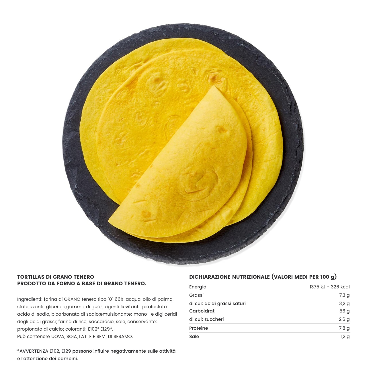 Farina di Grano tenero tipo 0 (66%), acqua, olio di palma e stabilizzanti: glicerolo, gomma di guar, agenti lievitanti: pirofosfato, acido di sodio, bicarbonato di sodio, emulsionante: mono e digliceridi degli acidi grassi, farina di riso, saccarosio, sale, conservante, propinato di calcio, coloranti: E102*, E129*.